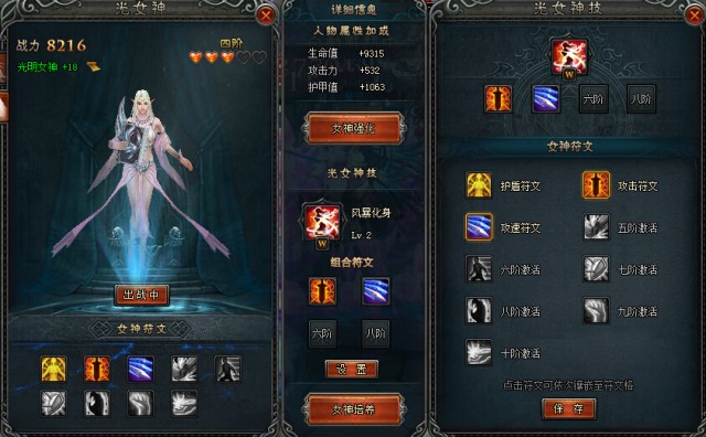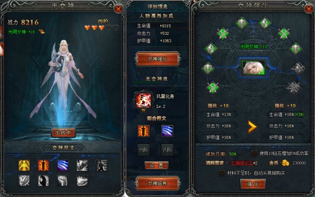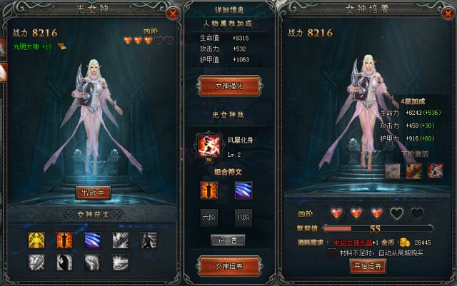 ★通过“女神培养”和“女神强化”可以提升女神的属性,“女神培养”也可以提升特技等级并激活新的女神符文,同时女神的外形也会随着等阶的提升而改变;