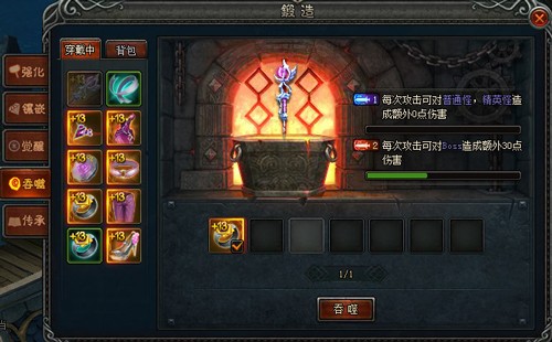 ★吞噬紫色以下品质装备可提供针对非BOSS怪物的额外属性,吞噬橙色以上品质装备可提供针对BOSS怪物的额外属性;